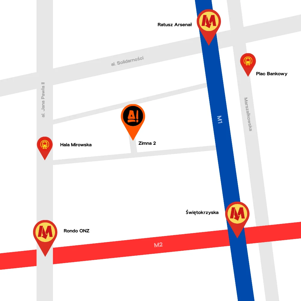 Nasza szkoła mieści się w samym centrum Warszawy, przy ulicy Zimnej 2. Lokalizacja zapewnia świetny dostęp komunikacją miejską: